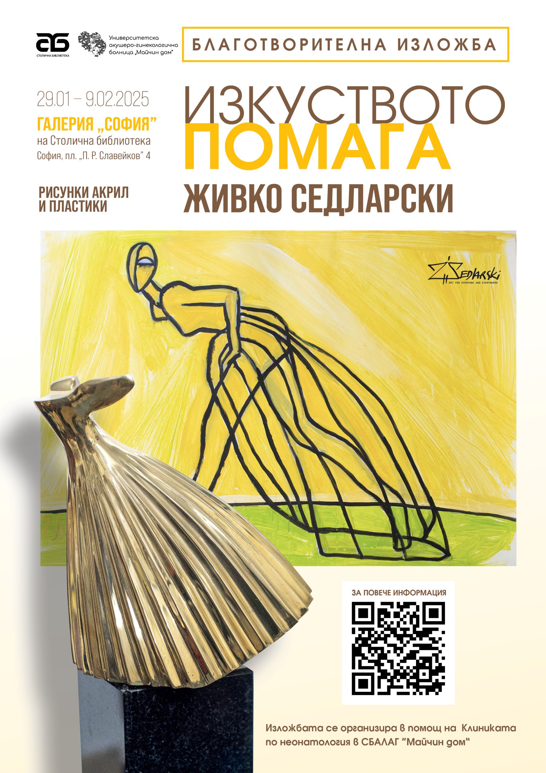 Българският скулпторЖивко Седларски, който през последните 33 години живее във Франция, организира благотворителна изложба „Изкуството помага“ в помощ на недоносените деца. Официалното откриване на изложбата с рисунки акрил и пластики е на29 януари 2025 г. от 16.00 ч. в галерия „София” на Столична библиотека и може да бъде разгледана до 9 февруари 2025 г.